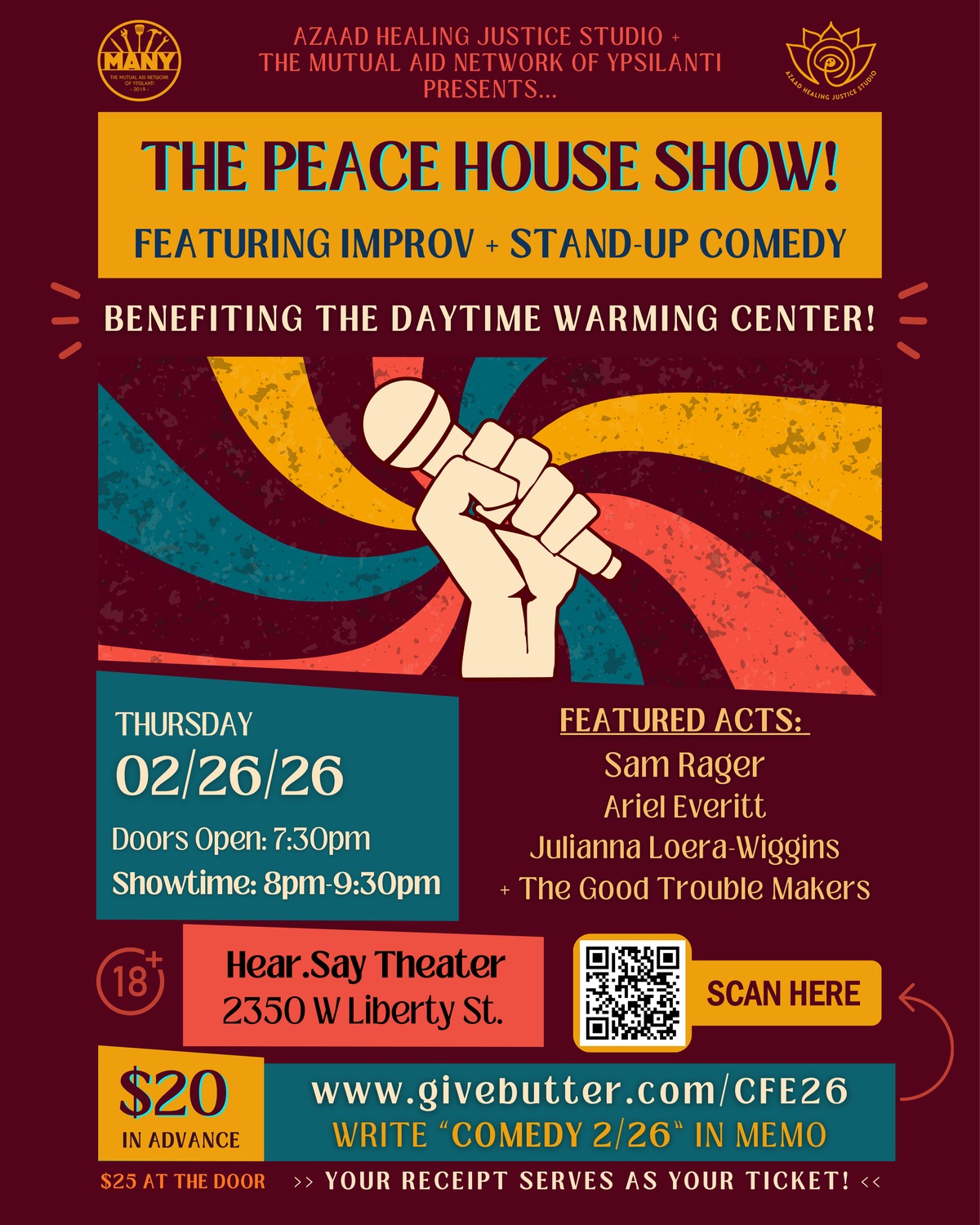 ☮️ Support this vital community resource by attending the show, sharing this post, & following Peace House, Ypsi & the Daytime Warming Center of Washtenaw County on social media to donate directly, volunteer, or help with mutual aid requests.